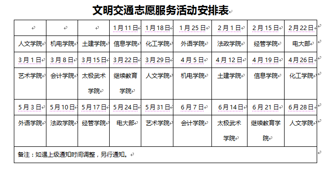 每周五為全市志愿服務日,志愿者在以下三個路口開展文明交通志愿服務活動。三個路口:豐收路與焦東路交叉口(龍源湖北門)、豐收路與長恩路交叉口(市科技館)、人民路與山陽路交叉口(師專西北角)。活動主題是文明交通:每個十字路口4-8人,戴小紅帽,穿紅馬甲,執小紅旗配合交警引導車輛行人文明交通,勸阻闖紅燈、逆行等不文明行為。活動時間是每周五早:7:30-8:30. 晚:17:00-18:00(五一之后早:7:30-8:30. 晚:17:30-18:30 )。此項活動由各院部組織開展,黨員志愿者帶頭,動員青年志愿者積極參與,并做好安全教育工作。