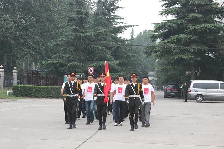 伴隨著莊嚴的樂曲,英姿颯爽的國旗護衛隊隊員們昂首闊步,行進于會場,國旗隨著國歌聲響迎風飄揚。在場人員向國旗行注目禮,深情對著祖國無線的熱愛個崇高的敬意。