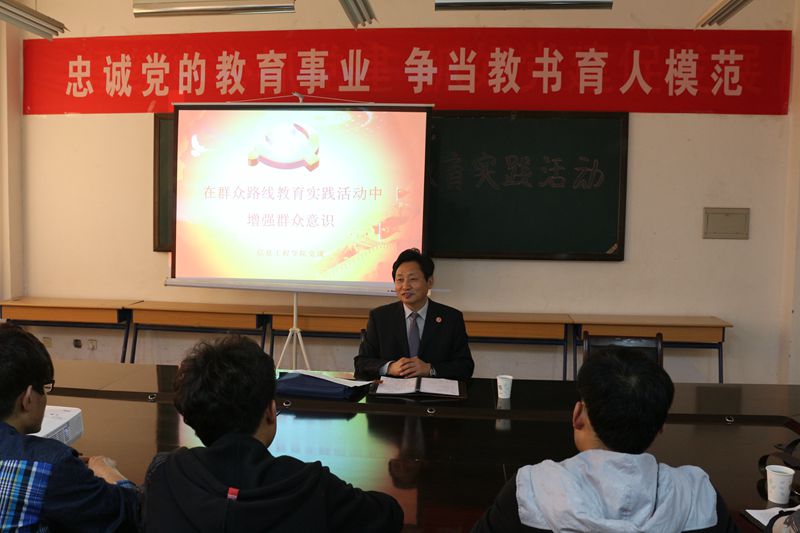 按照我校黨的群眾路線實踐教育活動的安排,4月4日下午,校黨委副書記、校長林效廷同志在信息工程學院會議室為全院學生黨員、入黨積極分子上了一堂題為“在群眾路線教育實踐活動中增強群眾意識”的黨課。校組織部張莉同志出席了黨課,學院學生黨員和入黨積極分子50余人參加了黨課培訓。黨課由信息工程學院黨總支書記毋彩虹同志主持。