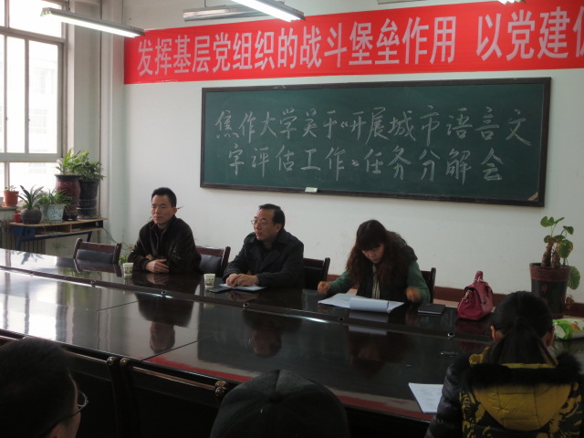 3月5日上午10點,焦作大學關于《開展城市語言文字評估工作》任務分解會議在人文學院會議室召開。人文學院院長、焦作大學語言文字工作委員會副主任熊志潮主持會議,焦作大學教務處處長、焦作大學語言文字工作委員會副主任李向東就評估工作的目標、意義、內容和要求做了重要講話。校語委辦主任苗濤及各部門評估工作聯系人出席會議。這次會議的主題是,全面落實城市語言文字評估工作,動員全校各部門振奮精神,鼓足干勁,確保圓滿完成今年評估工作的各項目標任務。