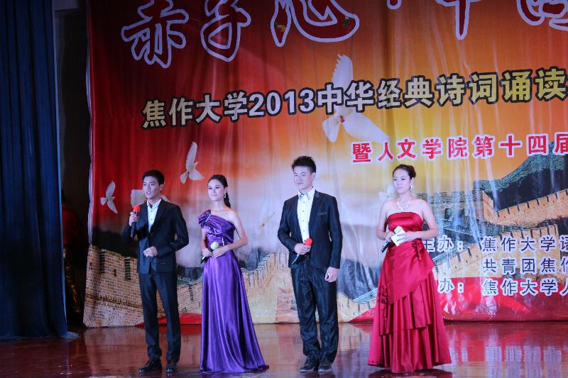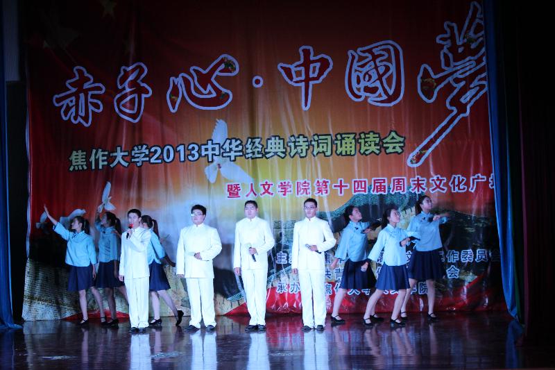 2013年10月28日下午,“焦作大學2013中華經典誦讀大會暨人文學院第十四屆周末文化廣場”在焦作大學南校區報告廳成功舉辦。