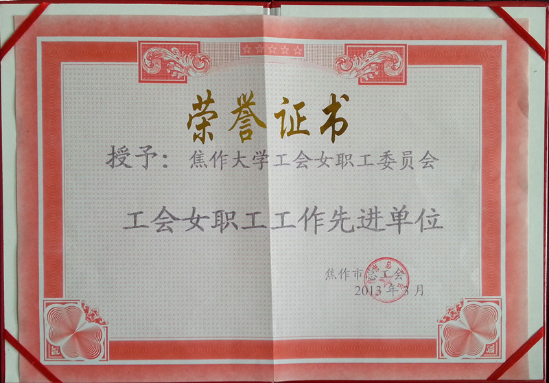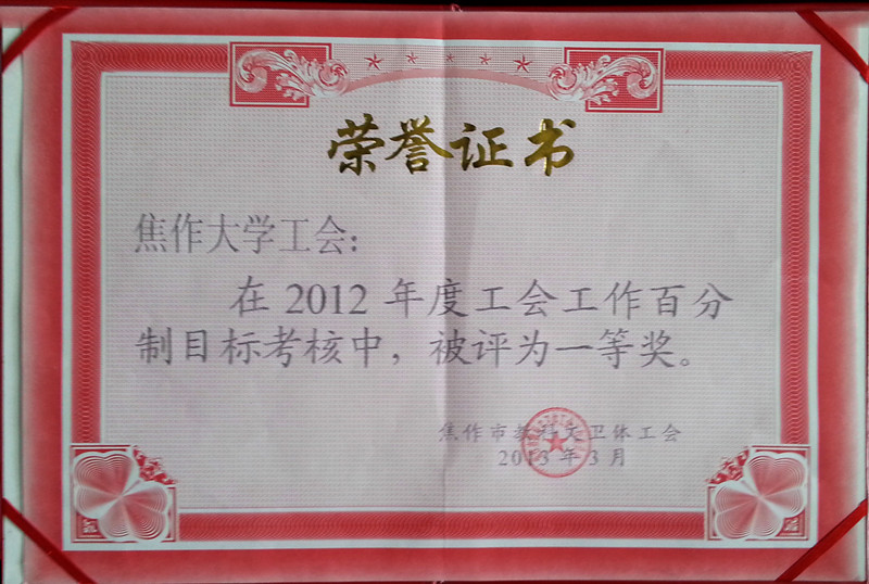 2013年4月24日,市總工會在東方賓館會議廳召開了工會年度工作會議,并對2012年度我市教科文衛體系統各基層工會先進單位和先進個人進行了表彰。在這次表彰中,我校工會榮獲“2012年度工會工作百分制目標考核”一等獎”。我校工會女職工委員會榮獲“焦作市總工會女職工工作先進單位”稱號。工會主席楊中漢榮獲“焦作市總工會先進工會工作者”榮譽稱號。