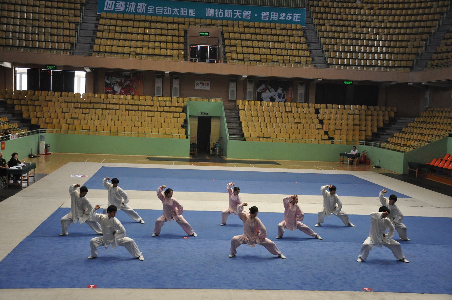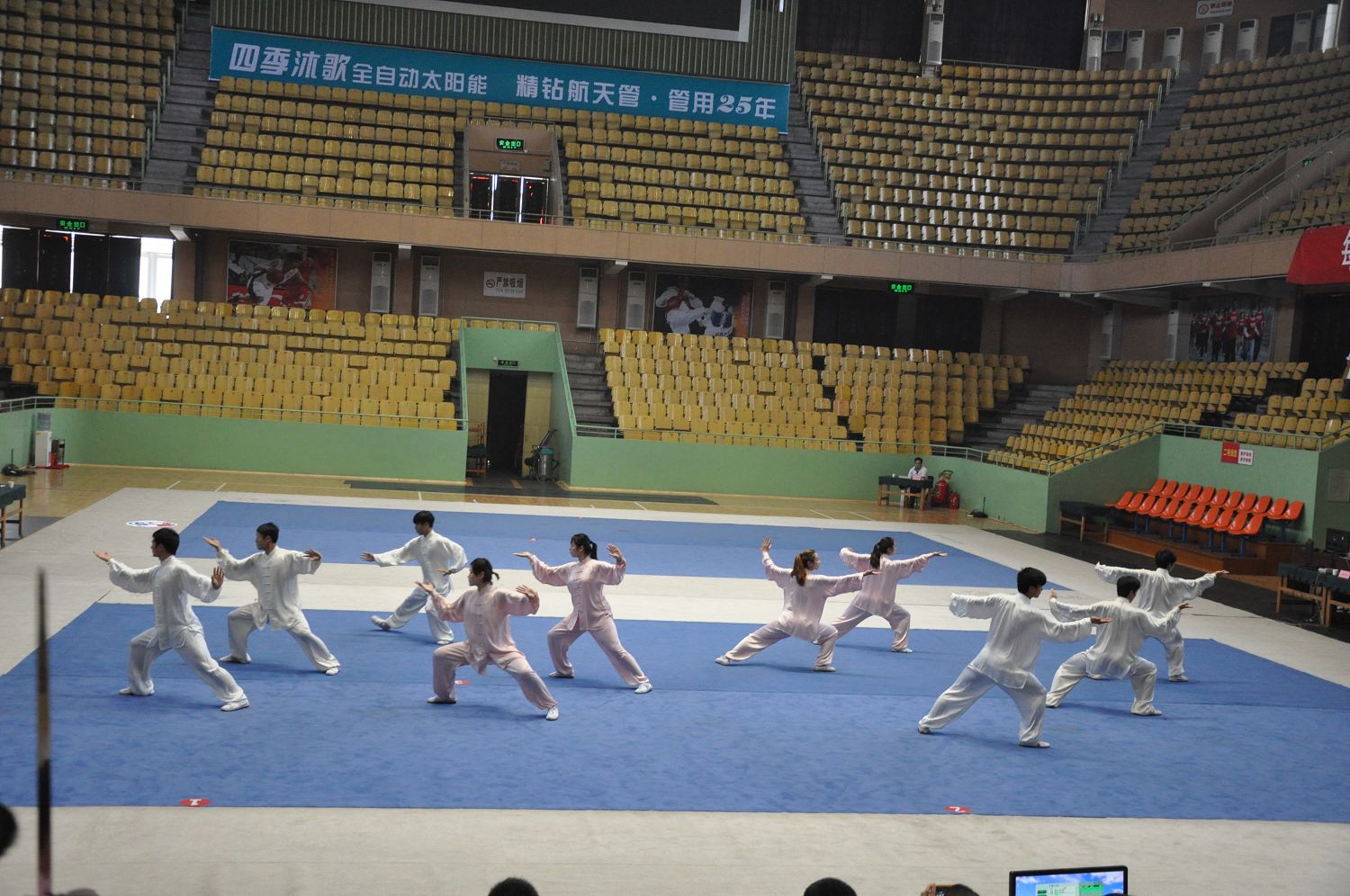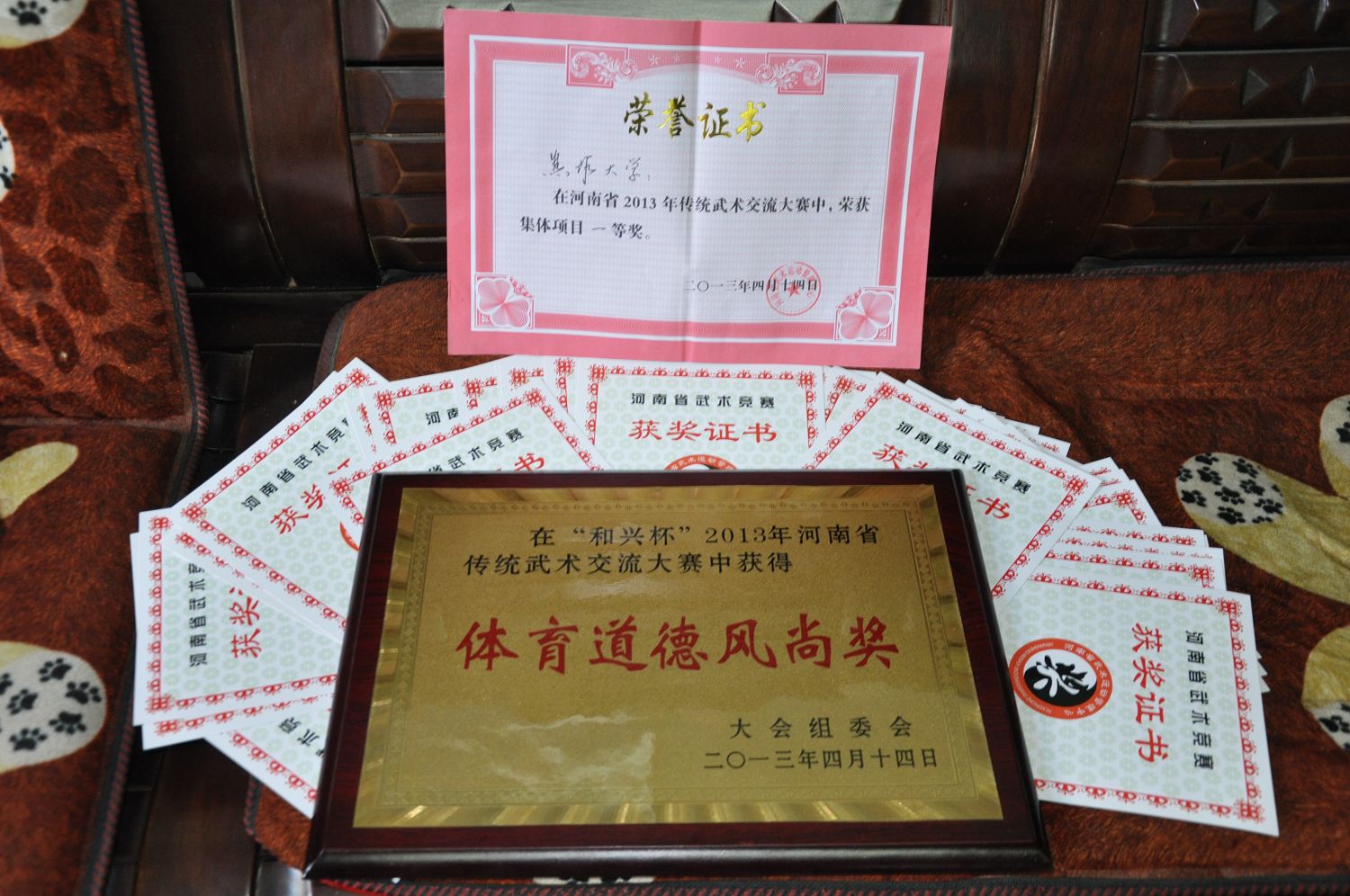 由河南省體育局主辦,河南省武術運動管理中心、河南省武術協會、焦作市體育局承辦的河南省傳統武術交流大賽于2013年4月11日—13日在焦作市武術館隆重舉行,本屆傳統武術交流大賽共有來自各省轄市、縣武術協會、武術之鄉、武術學校、武術團體等代表隊參加了本次比賽,我校共派出20名參賽人員(教練員和運動員)。在比賽中,我校代表隊技壓群雄、勇爭一流,經過兩天激烈的角逐,共有8人獲得了一等獎,11人獲得二等獎。其中獲得一等獎第一名的有6人;集體項目榮獲第一名。