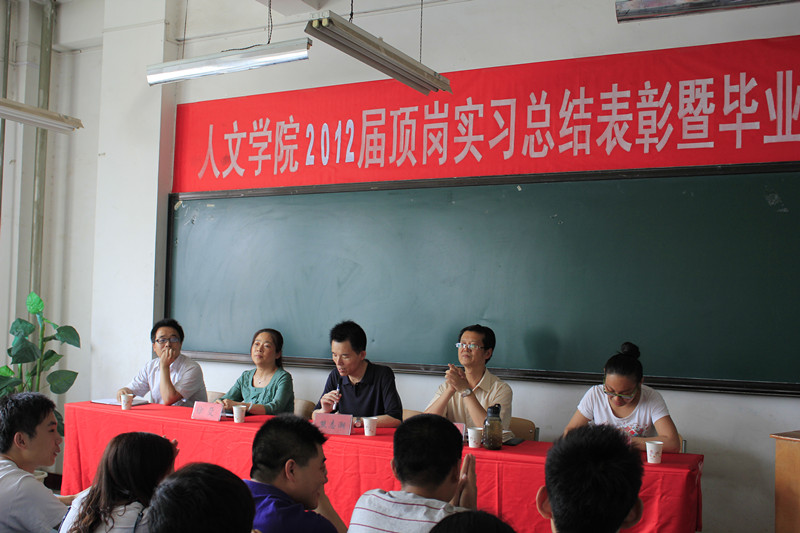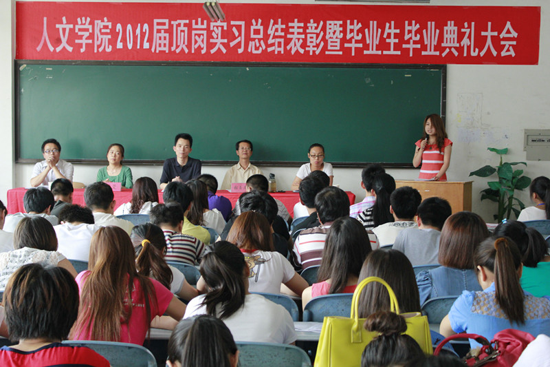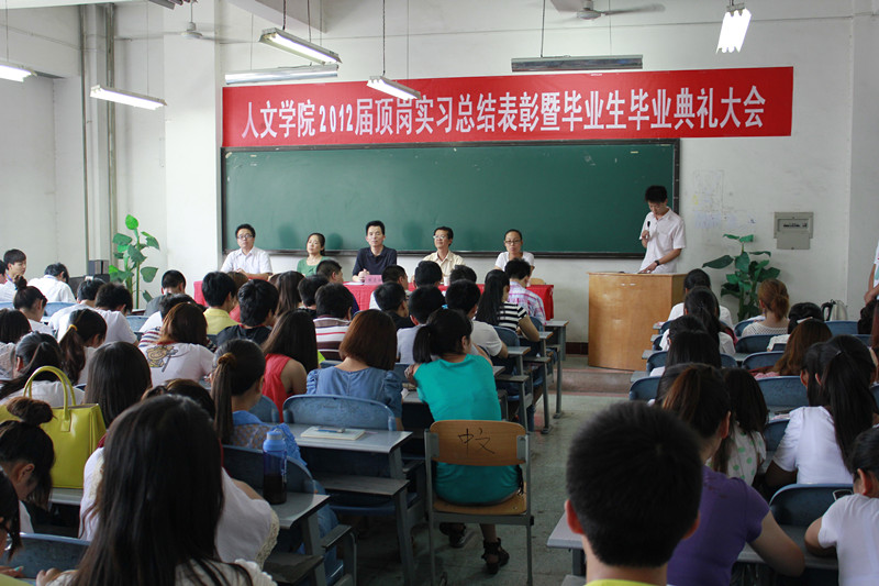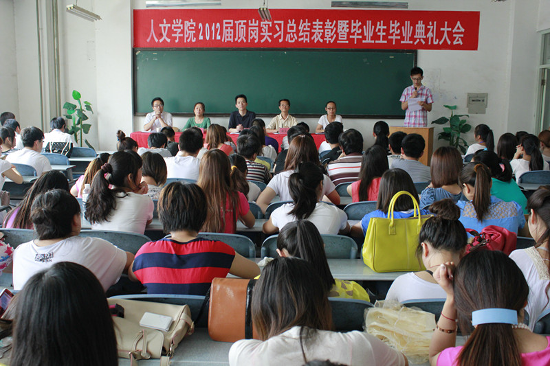 2012年6月1日下午3點,人文學院2012屆頂崗實習總結表彰暨畢業生畢業典禮大會在焦作大學南校區崇學樓401教室召開。人文學院院長熊志潮、黨總支書記張玉雁、副院長徐曼、人文學院學生工作辦公室主任郭春鳳、2012屆畢業生頂崗實習工作負責人孫衛峰等領導和老師出席了本次大會。大會由人文學院院長熊志潮主持。