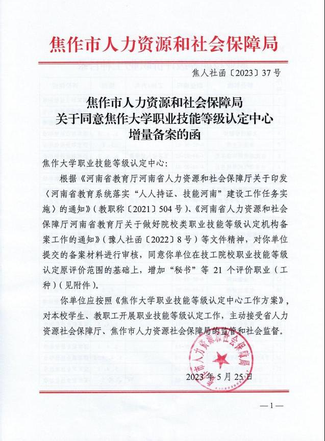 近日,我校申請(qǐng)?jiān)隽總浒傅穆殬I(yè)(工種)獲人社部職業(yè)技能鑒定中心公示并通過(guò)。由焦作市人力資源和社會(huì)保障局發(fā)函,審核批準(zhǔn)我校新增21個(gè)職業(yè)(工種)等級(jí)認(rèn)定資質(zhì)。至此,焦作大學(xué)職業(yè)技能等級(jí)認(rèn)定中心共有37個(gè)職業(yè)(工種)可面向我校學(xué)生開(kāi)展職業(yè)技能等級(jí)認(rèn)定,拓寬了學(xué)校職業(yè)等級(jí)認(rèn)定范圍,基本滿足了我校各專業(yè)學(xué)生職業(yè)技能等級(jí)認(rèn)定需求。