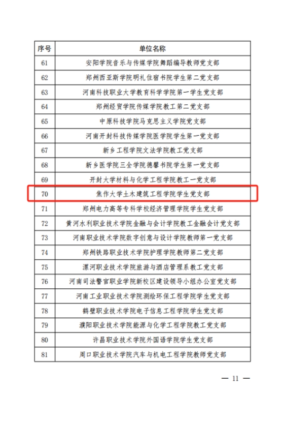 近日,中共河南省委教育工作委員會下發了《關于公布第二批全省高校黨建工作強基引領“三級聯創”評選結果的通知》(〔2024〕32號),我校土木建筑工程學院學生黨支部被評為“全省黨建工作樣板黨支部”。這是我校學生支部第一次獲得此項殊榮。