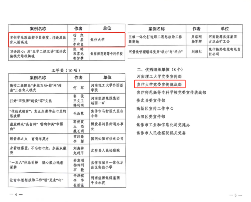 近日,中共焦作市委宣傳部下發了《關于表揚焦作市2024年度基層思想政治工作優秀案例和優秀組織單位的通報》,我校經濟管理學院報送的《首創學生政治指導員制度、打造思政育人新高地》榮獲焦作市基層思想政治工作優秀案例二等獎,校黨委宣傳統戰部榮獲優秀組織單位。