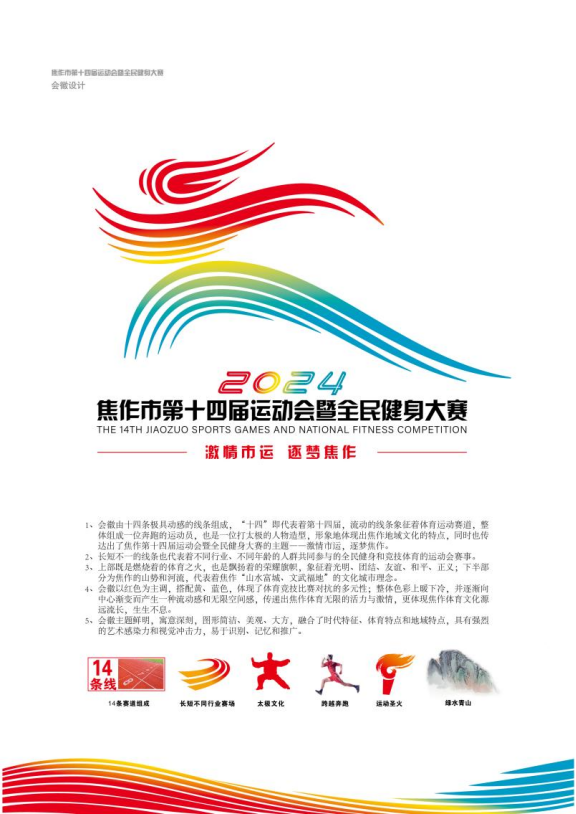 會(huì)徽的設(shè)計(jì)由14條極具動(dòng)感的線條組成,“14”代表著第十四屆,流動(dòng)的線條象征著體育運(yùn)動(dòng)賽道,整體組成一位奔跑的運(yùn)動(dòng)員,也是一位打太極的人物造型,形象地體現(xiàn)出焦作地域文化的特點(diǎn),同時(shí)也傳達(dá)出了焦作第十四屆運(yùn)動(dòng)會(huì)暨全民健身大賽的主題——激情市運(yùn)、逐夢(mèng)焦作。長(zhǎng)短不一的線條也代表著不同行業(yè)、不同年齡的人群共同參與的全民健身和競(jìng)技體育的運(yùn)動(dòng)賽事。會(huì)徽上部既是燃燒著的體育之火,也是飄揚(yáng)著的榮耀旗幟,象征著光明、團(tuán)結(jié)、友誼、和平、正義;下半部分為焦作的山勢(shì)與河流,代表著焦作文化城市理念。整體以紅色為主調(diào),搭配黃、藍(lán)色,體現(xiàn)了體育競(jìng)技比賽對(duì)抗的多元性;整體色彩上暖下冷,并逐漸向中心漸變而產(chǎn)生一種流動(dòng)感和無(wú)限空間感,傳遞出焦作體育無(wú)限的活力與激情,更體現(xiàn)焦作體育文化源遠(yuǎn)流長(zhǎng),生生不息。會(huì)徽主題鮮明、寓意深刻,圖形簡(jiǎn)潔、美觀、大方,融合了時(shí)代特征、體育特點(diǎn)和地域特點(diǎn),具有強(qiáng)烈的藝術(shù)感染力和視覺沖擊力,易于識(shí)別、記憶和推廣。