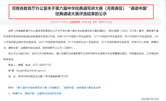 近日,河南省教育廳舉辦第六屆中華經(jīng)典誦寫講大賽“誦讀中國(guó)”經(jīng)典誦讀大賽。我校人文學(xué)院學(xué)生霍子璇、毋宇豪的作品《就是那一只蟋蟀》,陳冠仲、李少萌的作品《白馬篇》分別獲得職業(yè)教育學(xué)生組一等獎(jiǎng)和二等獎(jiǎng);姜楠、劉成君、扈曉婕、馬貝貝老師獲得最佳指導(dǎo)教師稱號(hào)。