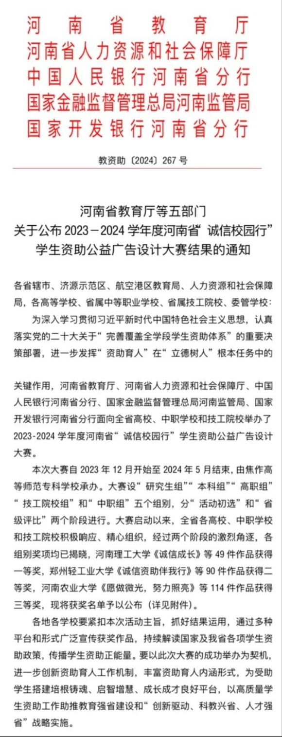 近日,河南省教育廳等五部門公布了2023-2024學年度河南省“誠信校園行”學生資助公益廣告設計大賽結果,我校選送的兩件作品榮獲一等獎和二等獎的佳績!