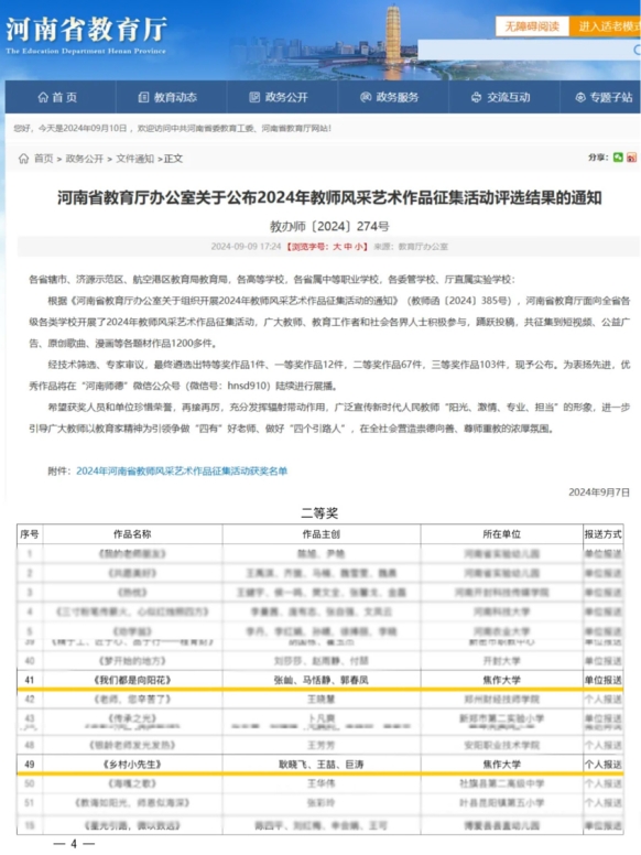 近日,河南省教育廳辦公室公布了2024年教師風采藝術作品征集活動評選結果。我校人文學院教師張屾、馬恬婧、郭春鳳的作品《我們都是向陽花》和藝術學院教師耿曉飛、王喆、巨濤的作品《鄉村小先生》均榮獲二等獎。