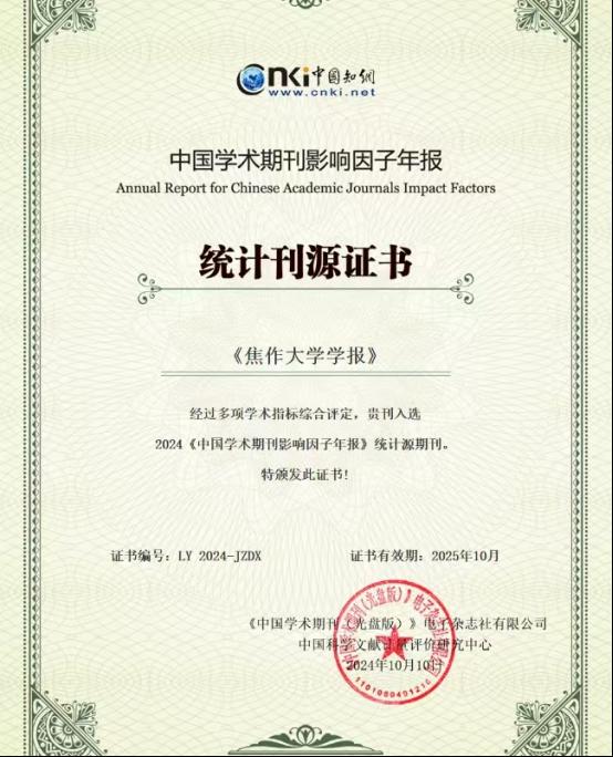 在學(xué)校領(lǐng)導(dǎo)關(guān)心指導(dǎo)和全校各部門支持下,我校學(xué)報(bào)學(xué)術(shù)影響因子連續(xù)四年穩(wěn)步提升。2024年10月10日,經(jīng)中國(guó)科學(xué)文獻(xiàn)計(jì)量評(píng)價(jià)研究中心和中國(guó)知網(wǎng)對(duì)多項(xiàng)學(xué)術(shù)指標(biāo)綜合評(píng)定,《焦作大學(xué)學(xué)報(bào)》入選“中國(guó)學(xué)術(shù)期刊影響因子統(tǒng)計(jì)刊源”。入選“中國(guó)學(xué)術(shù)期刊影響因子統(tǒng)計(jì)刊源”標(biāo)志著我校學(xué)報(bào)辦刊質(zhì)量和學(xué)術(shù)影響力提升到一個(gè)新水平。