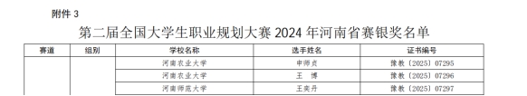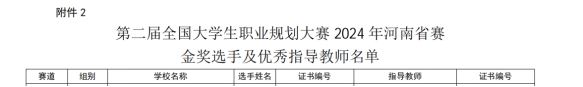 近日,河南省教育廳公布了第二屆全國大學生職業規劃大賽2024年河南省賽獲獎名單。我校化工與環境工程學院黃佳楠同學榮獲成長賽道職教組金獎,人工智能學院周嘉惠同學榮獲就業賽道職教組銀獎,人工智能學院王森同學榮獲成長賽道職教組銅獎,學校榮獲“優秀組織獎”。
