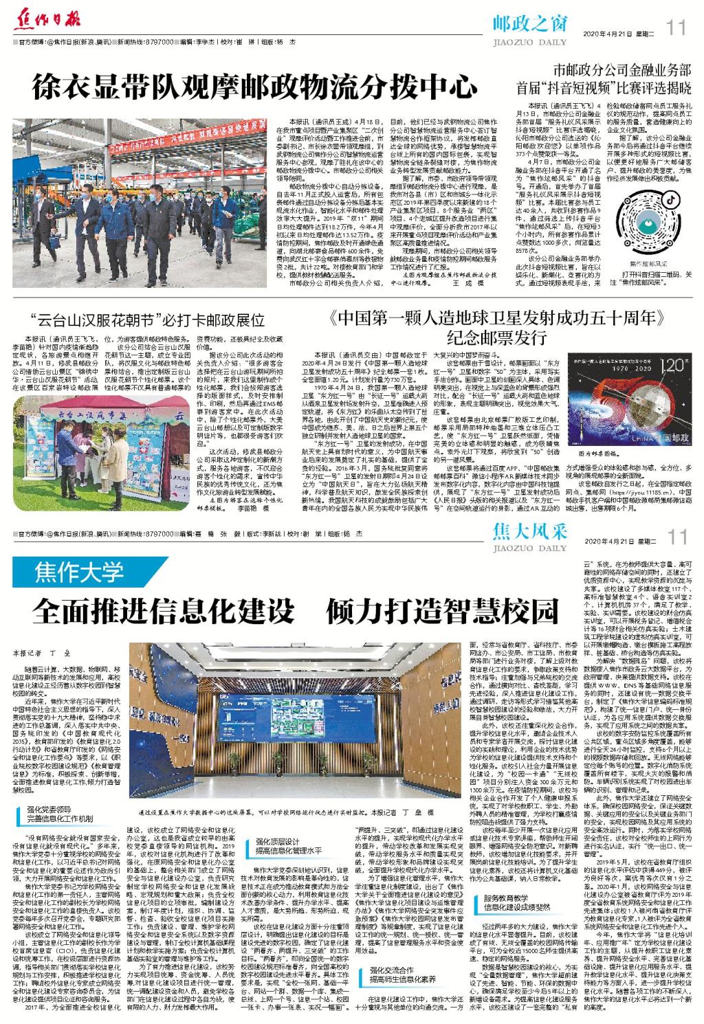 2020年04月21日,焦作日報以半版內容展示焦大風采,刊登名為《全面推進信息化建設 傾力打造智慧校》的文章,對我校在推進信息化建設和智慧校園建設中,積極探索、創新舉措的工作內容進行了報道,內容如下: