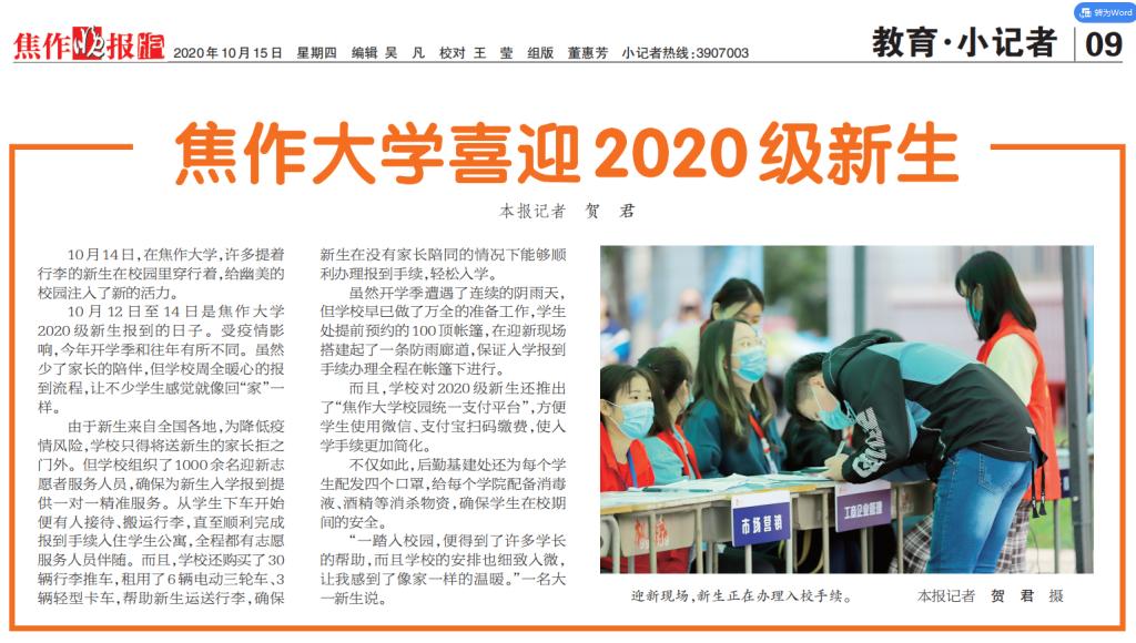 2020年10月15日,焦作晚報以《焦作大學喜迎2020級新生》為題,對我校2020級新生入學情況進行了報道。內容如下:
