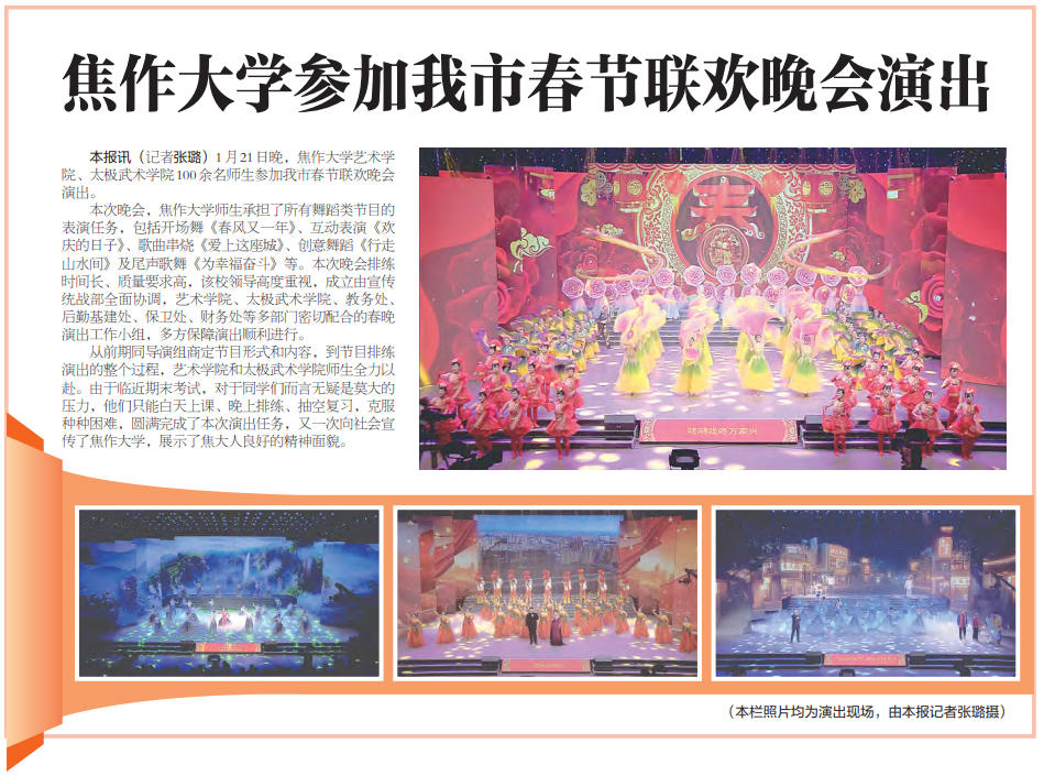 近日,焦作日報對我校參加我市春節(jié)聯(lián)歡晚會演出情況進(jìn)行報道。