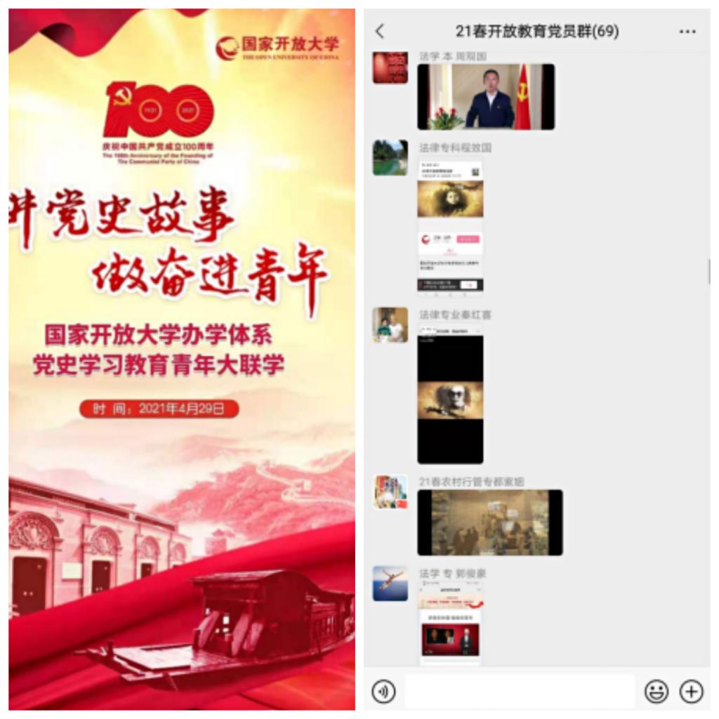 根據(jù)《國家開放大學(xué)關(guān)于開展紀(jì)念建黨100周年學(xué)生主題教育系列活動的通知》相關(guān)安排,4月29日,國家開放大學(xué)面向辦學(xué)體系全體師生,在五四青年節(jié)前夕舉辦“講黨史故事、做奮進青年”辦學(xué)體系黨史學(xué)習(xí)教育青年大聯(lián)學(xué)。我院認真組織,及時將通知和《國家開放大學(xué)學(xué)習(xí)網(wǎng)》網(wǎng)上的鏈接通過各班主任轉(zhuǎn)發(fā)班級群,要求全體師生認真收看學(xué)習(xí)。學(xué)工黨支部還將通知和活動鏈接重點推送到“21春開放教育黨員群”,指導(dǎo)學(xué)生黨員積極收看。