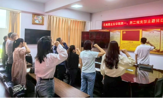 在學院黨員活動室,全體黨員和思政課教師學習了《習近平新時代中國特色社會主義思想專題摘編》第十一章“以自我革命精神推進全面從嚴治黨”,和《中國共產黨紀律處分條例》部分章節內容。全體黨員面對黨旗,重溫入黨誓詞。第一、第二黨支部分別為趙語慧和孫聚團兩名同志過政治生日,并為他們贈送了政治生日賀卡。全體黨員繳納了當月黨費。